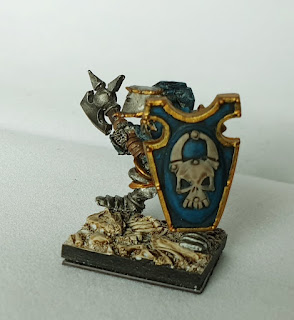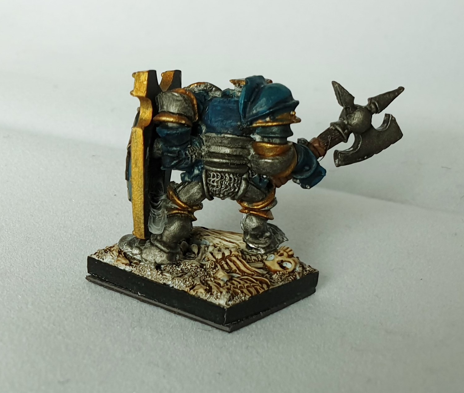 So I was looking for other colours that would fit. I settled with blue on him. The blue is done with GW Stegadon Blue, I small wash of GW Drakenhof Nightshade and Highlights of GW Stegadon Blue and GW Templeguard Blue.
