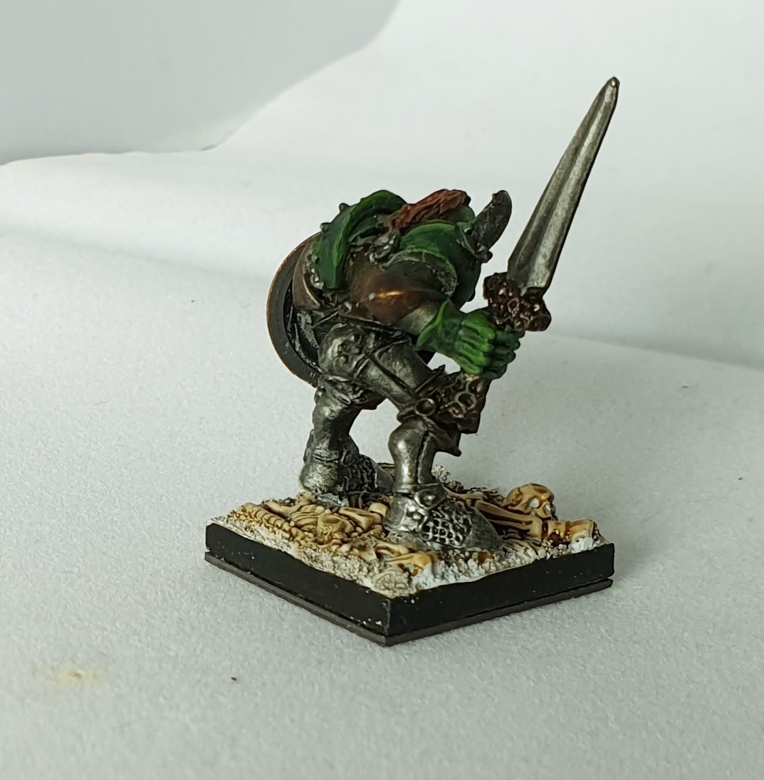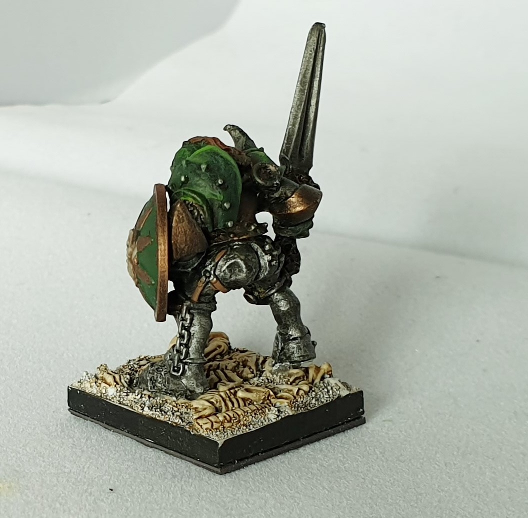 Here we have another Chaos Warrior of which I tought, he was a Champion. This time a Nurgle Champion. The armour always looked cery insect-like to me and so I associated it with the Father of Flies. In 9th Age there is no Nurgle anymore, so I don’t have to make him disgusting. He is just a warrior with green armour.